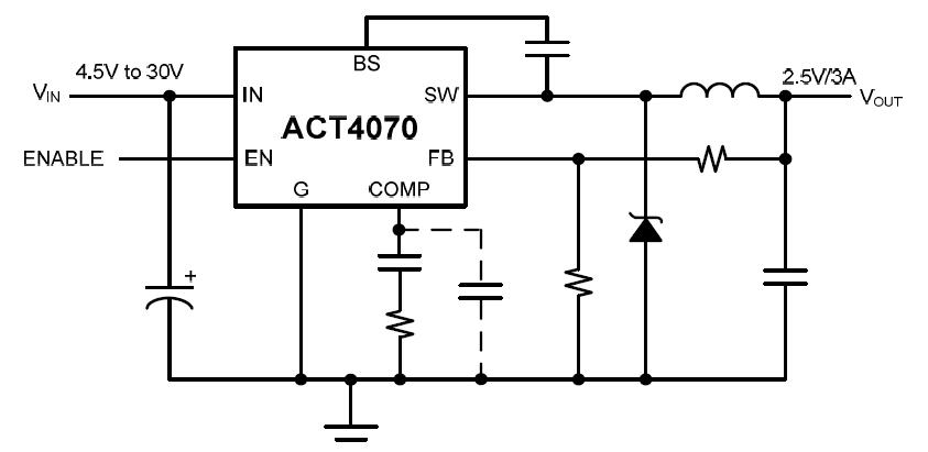 The ACT4070YH is a current-mode step-down DC/DC converter that generates up to 3A output current at 400 kHz switching frequency. The device utilizes Active-Semi’s proprietary ISOBCD30 process for operation with input voltage up to 30V. Consuming only 6μA in shutdown mode, the ACT4070YH is highly efficient with peak efficiency at 95% when in operation. Protection features include cycle-by-cycle current limit, thermal shutdown, and frequency fold back at short circuit. The device also includes an internal soft start function to prevent overshoot. The applications of the ACT4070YH include TFT LCD Monitors or Televisions and HDTV, Portable DVD Players, Car-Powered or Battery-Powered Equipment, Set-Top Boxes, Telecom Power Supplies, DSL and Cable Modems and Routers.