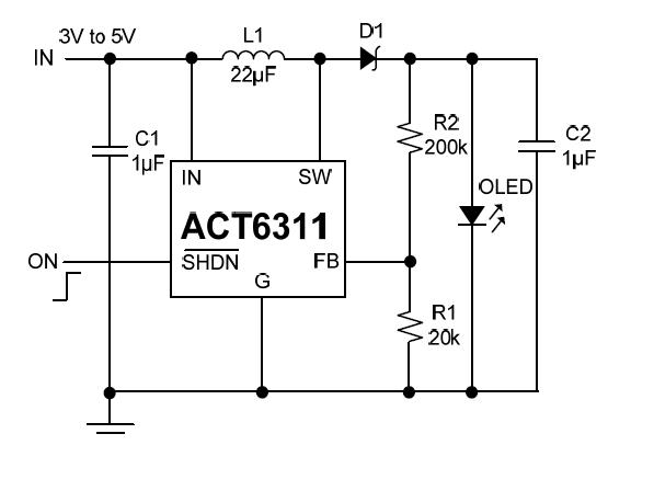 ACT6311 features: (1)Adjustable Output Voltage; (2)Drives OLEDs or White LEDs; (3)30V High Voltage Switch; (4)1MHz Switching Frequency; (5)Tiny Inductors and Capacitors; (6)Tiny SOT23-5 Package.