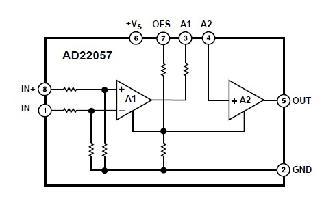 AD22057RZ-REEL features: (1)Gain of ×20. Alterable from ×1 to ×160; (2)Input CMR from Below Ground to 6× (VS – 1 V); (3)Output Span 20 mV to (VS – 0.2) V; (4)1-, 2-, 3-Pole Low-Pass Filtering Available; (5)Accurate Midscale Offset Capability; (6)Differential Input Resistance 400 kΩ; (7)Drives 1 kΩ Load to +4 V Using VS = +5 V; (8)Supply Voltage: +3.0 V to +36 V; (9)Transient Spike Protection and RFI Filters Included; (10)Peak Input Voltage (40 ms): 60 V; (11)Reversed Supply Protection: –34 V; (12)Operating Temperature Range: –40℃ to +125℃.