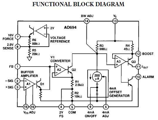 The AD694ARZ is a monolithic current transmitter that accepts high level signal inputs to drive a standard 4–20 mA current loop for the control of valves, actuators, and other devices commonly used in process control. The input signal of AD694ARZ is buffered by an input amplifier that can be used to scale the input signal or buffer the output from a current mode DAC. Precalibrated input spans of 0 V to 2 V and 0 V to 10 V are selected by simple pin strapping; other spans of the AD694ARZ may be programmed with external resistor.