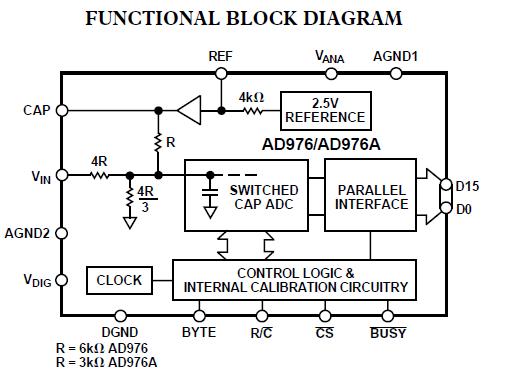 The AD976 is a high speed, low power 16-bit A/D converter that operates from a single 5 V supply. The part contains a successive approximation, switched capacitor ADC, an internal 2.5 V reference and a high speed parallel interface. The AD976 is factory calibrated to minimize all linearity errors. The analog full-scale input is the standard industrial range of ±10 V. The AD976 is comprehensively tested for ac parameters such as SNR and THD, as well as the more traditional parameters of offset, gain and linearity.