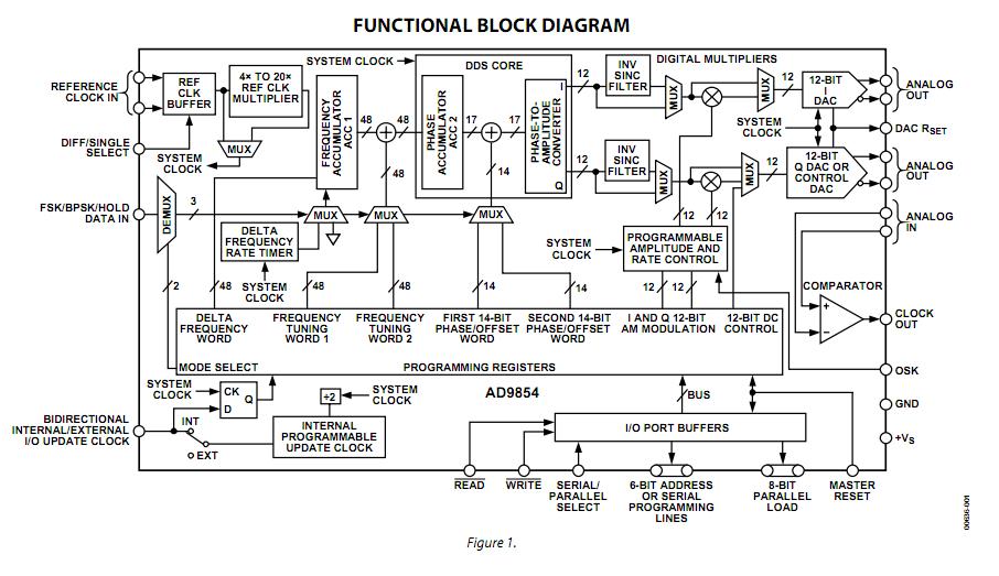 AD9854ASVZ features: (1)300 MHz internal clock rate; (2)FSK, BPSK, PSK, chirp, AM operation; (3)Dual integrated 12-bit digital-to-analog converters (DACs); (4)Ultrahigh speed comparator, 3 ps rms jitter; (5)Excellent dynamic performance 80 dB SFDR at 100 MHz (±1 MHz) AOUT; (6)4× to 20× programmable reference clock multiplier; (7)Dual 48-bit programmable frequency registers; (8)Dual 14-bit programmable phase offset register ; (9)12-bit programmable amplitude modulation and on/off output shaped keying function; (10)Single-pin FSK and BPSK data interfaces; (11)PSK capability via input/output interface; (12)Linear or nonlinear FM chirp functions with single-pin.
