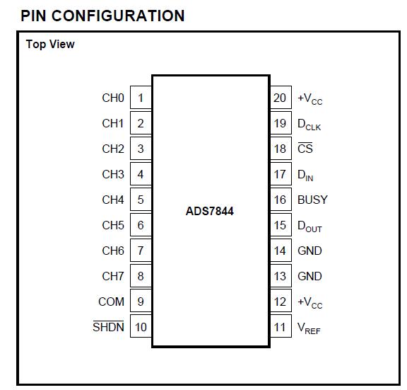 The ADS7844E is an 8-channel, 12-bit sampling analog-todigital converter (ADC) with a synchronous serial interface. Typical power dissipation is 3mW at a 200kHz throughput rate and a +5V supply. The reference voltage (VREF) can be varied between 100mV and VCC, providing a corresponding input voltage range of 0V to VREF. The ADS7844E includes a shutdown mode that reduces power dissipation to under 1μW. The ADS7844E is ensured down to 2.7V operation. The applications of the ADS7844E include data acquisition, test and measurement, industrial process control, personal digital assistants and battery-powered systems.