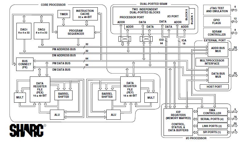 ADSP-21161NKCAZ100 features: (1)Two processing elements, each made up of an ALU, multiplier, shifter, and data register file; (2)Data address generators (DAG1, DAG2); (3)Program sequencer with instruction cache; (4)PM and DM buses capable of supporting four 32-bit data transfers between memory and the core every core processor cycle; (5)Interval timer; (6)On-Chip SRAM (1M bit); (7)SDRAM controller for glueless interface to SDRAMs; (8)External port that supports:; (9)Interfacing to off-chip memory peripherals; (10)Glueless multiprocessing support for six ADSP-21161N SHARCs; (11)Host port read/write of IOP registers; (12)DMA controller; (13)Four serial ports; (14)Two link ports; (15)SPI compatible interface; (16)JTAG test access port; (17)12 general-purpose I/O pins.