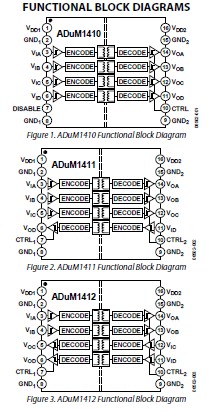 ADUM1410BRWZ features: (1)Bidirectional communication; (2)3 V/5 V level translation; (3)High temperature operation: 105℃; (4)Up to 10 Mbps data rate (NRZ); (5)Programmable default output state; (6)High common-mode transient immunity: >25 kV/μs; (7)16-lead, Pb-free, SOIC wide body package.