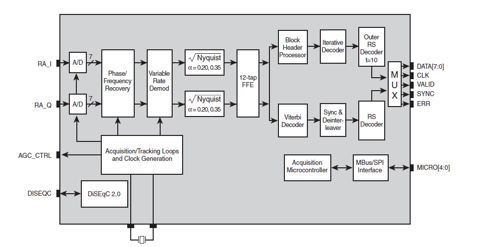 BCM4505KQLE49G features: (1)256-kilobaud to 30-megabaud variable rate receiver; (2)Supports BPSK, QPSK, 8PSK, & 16QAM modulation; (3)Dual integrated 7-bit A/D converters; (4)Digital square-root Nyquist filters (α=0.2, 0.35); (5)All-digital clock and carrier recovery; (6)12-tap adaptive equalizer; (7)Complies with DVB/DIRECTV/Digicipher IITM FEC decoder; (8)MPEG-2 or DIRECTV output interface with output clock PLL; (9)On-chip microcontroller for acquisition and tracking; (10)On-chip BERT for BER testing; (11)Integrated DiSEqCTM (v2.0)transmitter and receiver; (12)128-pin PQFP; (13)3.3V I/O and analog operation; (14)1.8V digital operation.