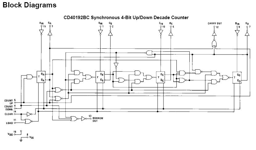 The CD40192BCN is a Synchronous 4-Bit Up/Down Decade Counter. It is monolithic complementary MOS (CMOS) integrated circuits. The CD40192BCN is a BCD counter. Counting up and counting down is performed by two count inputs, one being held HIGH while the other is clocked. The outputs change on the positive-going transition of this clock.