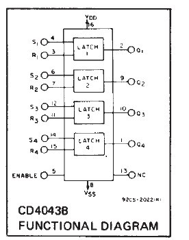 The CD4043BE is a quad cross-coupled 3-state CMOS NAND latch. The CD4043BE has a separate Q output and individual SET and RESET inputs. The Q output is controlled by a common ENABLE input. The applications of CD4043BE are: (1) Holding register in multi-register system; (2) Four bits of independent storage with output enable; (3) strobed register; (4) General digital logic.