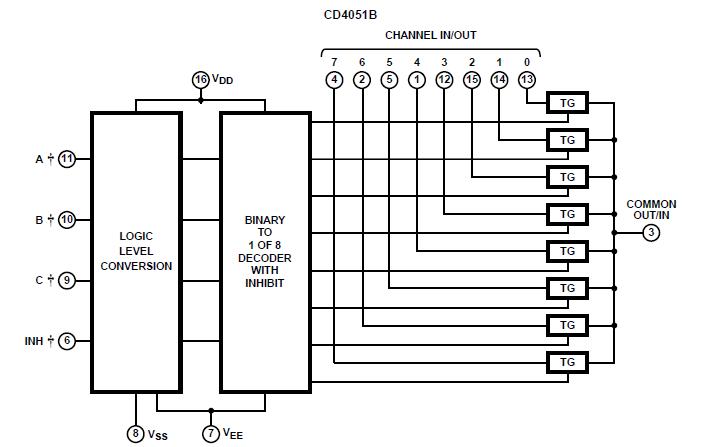The CD4051BWP is a CMOS Analog Multiplexers/Demultiplexer. The CD4051BWP is digitally-controlled analog switche having low ON impedance and very low OFF leakage current. Control of analog signals up to 20VP-P can be achieved by digital signal amplitudes of 4.5V to 20V (if VDD-VSS = 3V, a VDD-VEE of up to 13V can be controlled; for VDD-VEE level differences above 13V, a VDD-VSS of at least 4.5V is required). For example, if VDD = +4.5V, VSS = 0V, and VEE = -13.5V, analog signals from -13.5V to +4.5V can be controlled by digital inputs of 0V to 5V. The applications of the CD4051BWP include Analog and Digital Multiplexing and Demultiplexing, A/D and D/A Conversion, Signal Gating.