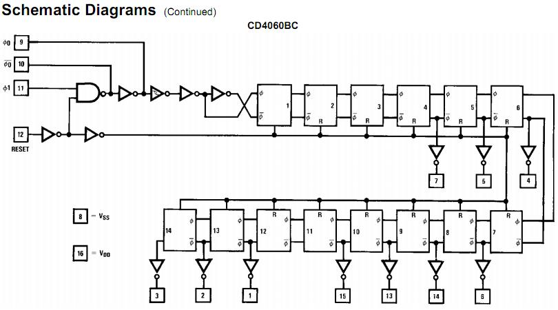 The CD4060BCM is a 14-stage ripple carry binary counter. The device is advanced one count on the negative transition of each clock pulse. The CD4060BCM is reset to the zero state by a logical 1 at the reset input independent of clock.