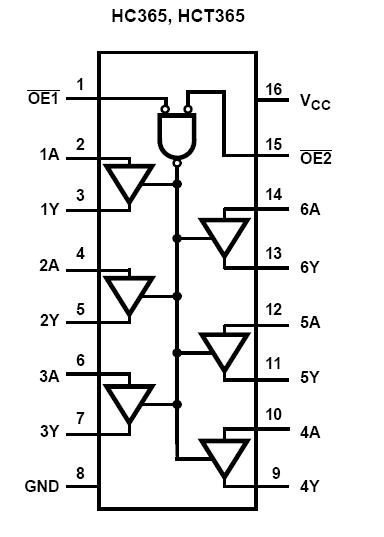 The CD74HCT365E is a High Speed CMOS Logic Hex Buffer/Line Driver, Three-State Non-Inverting and Inverting. The CD74HCT365E has high drive current outputs which enables high speed operation even when driving large bus capacitances. The CD74HCT365E possess the low power dissipation of CMOS circuitry, yet have speeds comparable to low power Schottky TTL circuits. Both circuits are capable of driving up to 15 low power Schottky inputs.