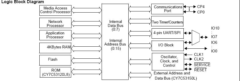CY7C53150-20AXIT features: (1)3.3V operation; (2)Three 8-bit pipelined processors for concurrent processing of application code and network traffic; (3)Hardware UART/SPI interface; (4)Eleven-pin I/O port programmable in 38 modes for fast application program development. I/O port is 5V input tolerant; (5)Two 16-bit timer/counters for measuring and generating I/O device waveforms; (6)Five-pin communication port that supports direct connect and network transceiver interfaces, and operates at 3.3V or 5V; (7)Programmable pull-ups on IO4-IO7 and 20mA sink current on IO0-O3; (8)Unique 48-bit Neuron ID number in every device to facilitate network installation and management; (9)0.35μm Flash process technology; (10)On-chip LVD circuit with programmable trip point and digital filter settings; (11)Programmable Pulse Stretching reset; (12)4,096 bytes of SRAM for buffering network data, system, and application data storage; (13)2.75KBytes (CY7C53150L), 8KBytes (CY7C53120L8) of Flash memory with on-chip charge pump for flexible storage of configuration data and application code; (14)Addresses up to 56KBytes of external memory (CY7C53150L); (15)16KBytes (CY7C53120L8) of ROM containing LonTalk. network protocol firmware; (16)Maximum input clock operation of 20MHz over -40℃ to 85℃ temperature range; (17)64-pin TQFP package (CY7C53150L); (18)32-pin SOIC or 44-pin TQFP package (CY7C53120L8).