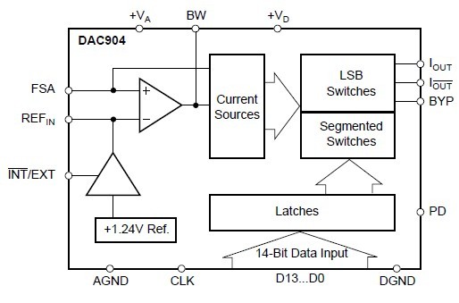 The DAC904E is a high-speed, digital-to-analog converter (DAC) offering a 14-bit resolution option within the SpeedPlus family of high-performance converters. Featuring pin compatibility among family members, the DAC904E provides a component selection option to an 8-, 10-, and 12-bit resolution, respectively. The DAC904E supports update rates in excess of 165MSPS with excellent dynamic performance, and are especially suited to fulfill the demands of a variety of applications. The DAC904E has a high impedance (200kW) current output with a nominal range of 20mA and an output compliance of up to 1.25V. The differential outputs allow for both a differential, or single-ended analog signal interface. The close matching of the current outputs ensures superior dynamic performance in the differential configuration, which can be implemented with a transformer.