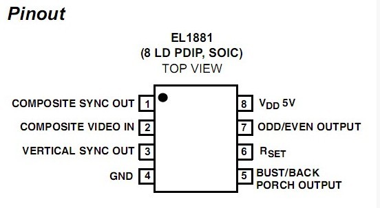 EL1881CN features: (1)NTSC, PAL, SECAM, non-standard video sync separation; (2)Fixed 70mV slicing of video input levels from 0.5VP-P to 2VP-P; (3)Low supply current - 1.5mA typ.; (4)Single +5V supply; (5)Composite, vertical sync output; (6)Odd/even field output; (7)Burst/back porch output; (8)Available in 8 Ld PDIP and SOIC packages; (9)Pb-free available (RoHS Compliant).