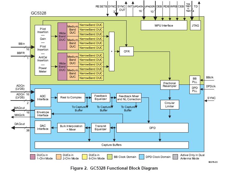 The GC5328IZER is a Low power wideband digital Predistortion Transmit Processor. The GC5328IZER includes a digital upconverter (DUC) block, a crest factor reduction (CFR) block, a digital predistortion (DPD) block, feedback (FB) block, and capture buffer (CB) blocks. The applications of the GC5328IZER include 3 GPP (W-CDMA) Base Stations, 3 GPP2 (CDMA2000) Base Stations, WiMAX, WiBRO, and LTE (OFDMA) Base Stations, Multicarrier Power Amplifiers (MCPAs).