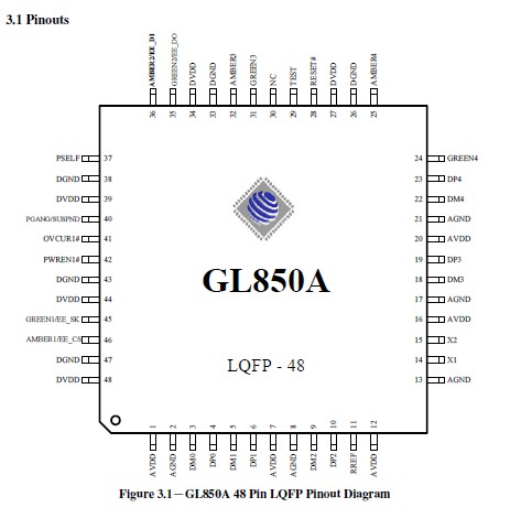 GL850 features: (1)Each downstream port supports two-color status indicator, with automatic and manual modes compliant to USB specification Revision 2.0; (2)Support both individual and gang modes of power management and over-current detection for downstream ports (64-pin LQFP); (3)Support gang mode of power management and over-current detection for downstream ports; (4)Conform to bus power requirements; (5)Automatic switching between self-powered and bus-powered modes; (6)Integrate USB 2.0 transceiver; (7)PLL embedded with external 12 MHz crystal; (8)Operate on 3.3 Volts; (9)Embed serial resister for USB signals and integrate pull-up resister for upstream USB signal; (10)Improve output drivers with slew-rate control for EMI reduction; (11)Internal power-fail detection for ESD recovery; (12)64/48-pin LQFP package.