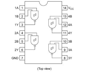 The HD74HC132FPEL is a Quad 2-input NAND Schmitt Trigger.