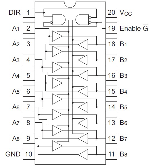 The HD74HC245R is an octal Bus Transceiver with 3-state outputs. The HD74HC245R has an active low enable input G and a direction control input (DIR). When DIR is high, data flows from the A inputs to the B outputs. When DIR is low, data flows from the B inputs to the A outputs. The HD74HC245R transfers true data from one bus to the other. This device does not have schmitt trigger inputs.
