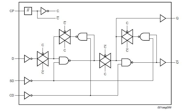 The HEF4013BT PB is a dual D-type flip-flop which features independent set direct (SD), clear direct (CD), clock inputs(CP) and outputs (O, O). Data is accepted when CP is LOW and transferred to the output on the positive-going edge of the clock. The active HIGH asynchronous clear-direct (CD) and set-direct (SD) are independent and override the D or CP inputs. The outputs of HEF4013BT PB are buffered for best system performance. Schmitt-trigger action in the clock input makes the circuit highly tolerant to slower clock rise and fall times. The applications of the HEF4013BT PB include: Automotive and industrial, Counters and dividers, Registers, Toggle flip-flops.