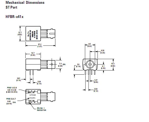 HFBR-2412TZ features: (1)Meets IEEE 802.3 Ethernet and 802.5 Token Ring Standards; (2)Meets TIA/EIA-785 100Base-SX standard; (3)Low Cost Transmitters and Receivers; (4)Choice of ST, SMA, SC or FC Ports; (5)820 nm Wavelength Technology; (6)Signal Rates up to 160 MBd; (7)Link Distances up to 2.7 km; (8)Specified with 50/125 μm, 62.5/125 μm, 100/140 μm, and 200μm HCS Fiber; (9)Repeatable ST Connections within 0.2 dB Typical; (10)Unique Optical Port Design for Efficient Coupling; (11)Auto-Insertable and Wave Solderable; (12)No Board Mounting Hardware Required; (13)Wide Operating Temperature Range -40℃ to +85℃; (14)AlGaAs Emitters 100% Burn-In Ensures High Reliability; (15)Conductive Port Option.