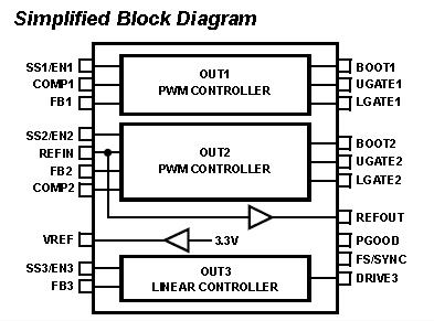 ISL6534CR features: (1)Two Synchronous-Rectified Buck Controllers: Voltage Mode control VIN range up to 12V VOUT range from 0.6V to 6V 12V LGATE drivers; up to 12V Boot Strap for UGATE; (2)Switcher References: 0.6V Reference for OUT1 (0.8% Accurate) 3.3V Reference Output for OUT2 (0.8% Accurate) External Reference Input for OUT2 Buffered VTT Reference Output; (3)Switcher clocking: Phase options for Optimal Clock Relationship Resistor-Selectable Switching Frequency (300kHz; (4)default; Resistor to Ground for 300kHz to 1MHz range) Synchronization-Capable Switching Frequency (Connect FS_SYNC to Separate Regulator); (5)Single Linear Controller: Drives N-Channel MOSFET 0.6V Reference (0.8% Accurate) VIN range up to 12V VOUT range from 0.6V to 6V; (6)12V and 5V supplies required (but optional shunt regulator: can generate VCC = 5.8V from 12V); (7)Three Independent Soft-Start/Enable Pins: Gang Together or Control Independently.