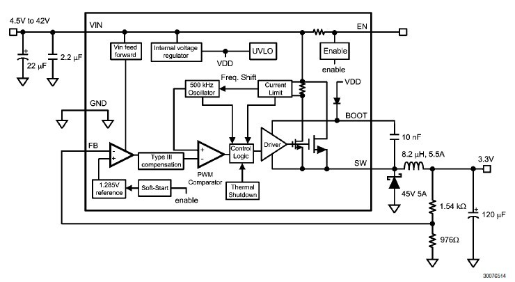 LM22676MRE-5.0 features: (1)Wide input voltage range: 4.5V to 42V; (2)Internally compensated voltage mode control; (3)Stable with low ESR ceramic capacitors; (4)120 mΩ N-channel MOSFET TO-263 THIN package; (5)100 mΩ N-channel MOSFET PSOP-8 package; (6)Switching frequency of 500 kHz; (7)-40℃ to 125℃ operating junction temperature range; (8)Precision enable pin; (9)Integrated boot diode; (10)Integrated soft-start; (11)Fully WEBENCHR enabled; (12)Step-down and inverting buck-boost applications.