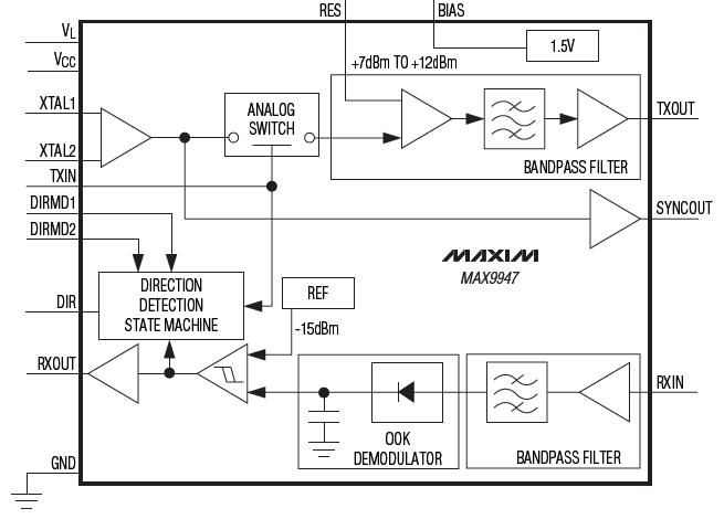 MAX9947ETE+T features: (1)Receiver wide input dynamic range -15dBm to +5dBm in 50Ω; (2)Variable Transmitter Output level from +7dBm to +12dBm; (3)AISG-Compliant Output Emission Profile; (4)AutoDirection Output; (5)No Need of Microcontrollers to Handle Bus Arbitration in Tower-Mounted Equipment; (6)Supports All AISG Data Rates; (7)Bandpass Filter Compliant with AISG Protocal Centered Around 2.176MHz; (8)3.0V to 5.5V Voltage Supply; (9)Independent Logic Supply; (10)Small, 3mm×3mm 16-Pin TQFN package.