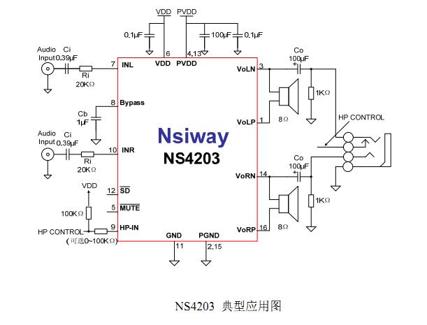 The NS4203 is a Low EMI, no filter, 3 W double track D class audio power amplifier.