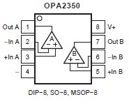 OPA2350UA features: (1)rail-to-rail input; (2)rail-to-rail output (within 10mV); (3)wide bandwidth: 38MHz; (4)high slew rate: 22V/μs; (5)low noise: 5nV/√Hz; (6)low thd+noise: 0.0006%; (7)unity-gain stable; (8)microsize packages; (9)single, dual, and quad.