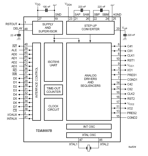 The TDA8007BHL is a cost-effective card interface for dual smart card readers. Controlled through a parallel bus, it meets all requirements of ISO 7816, GSM 11-11, EMV4.2 and EMV 2000. It is addressed on a non-multiplexed 8-bit databus, by means of address registers AD0, AD1, AD2 and AD3. The TDA8007BHL can be also addressed through a multiplexed access. The integrated ISO UART and the time-out counters allow easy use even at high baud rates with no real time constraints. Due to its chip select, external input/output and interrupt features, it greatly simplifies the realization of a reader of any number of cards. The TDA8007BHL gives the cards and the reader a very high level of security, due to its special hardware against ESD, short-circuiting, power failure, etc. The integrated step-up converter allows operation within a supply voltage range of 2.7 V to 6 V.