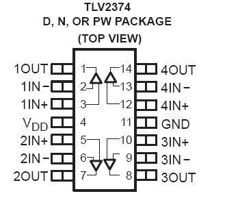 TLV2374IDR absolute maximum ratings: (1)Supply voltage, VDD (see Note 1): 16.5 V; (2)Differential input voltage, VID: ±VDD; (3)Input voltage range, VI (see Note 1): 0.2 V to VDD + 0.2 V; (4)Input current range, II:±10mA; (5)Output current range, IO: ±100mA; (6)Continuous total power dissipation: See Dissipation Rating Table; (7)Operating free-air temperature range, TA: I-suffix: -40℃ to 125℃; (8)Maximum junction temperature, TJ: 150℃; (9)Storage temperature range, Tstg: -65℃ to 150℃; (10)Lead temperature 1,6 mm (1/16 inch) from case for 10 seconds: 260℃.