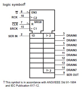 The TPIC6C596DRG4 is a monolithic, medium-voltage, low-current power 8-bit shift register designed for use in systems that require relatively moderate load power such as LEDs. The TPIC6C596DRG4 contains a built-in voltage clamp on the outputs for inductive transient protection. Power driver applications include relays, solenoids, and other low-current or medium-voltage loads. The TPIC6C596DRG4 contains an 8-bit serial-in, parallel-out shift register that feeds an 8-bit D-type storage register.