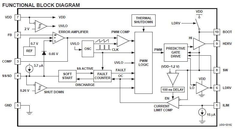 The TPS40007D is a controller for low-voltage, non-isolated synchronous buck regulator. The TPS40007D drives an N-channel MOSFET for the primary buck switch, and an N-channel MOSFET for the synchronous rectifier switch, thereby achieving very high-efficiency power conversion. In addition, the TPS40007D controls the delays from main switch off to rectifier turn-on and from rectifier turn-off to main switch turn-on in such a way as to minimize diode losses (both conduction and recovery) in the synchronous rectifier with TI proprietary Predictive Gate Drive technology. The reduction in these losses is significant and increases efficiency. For a given converter power level, smaller FETs can be used, or heat sinking can be reduced or even eliminated.