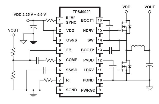 TPS40020PWP features: (1)Operating Input Voltage 2.25 V to 5.5 V; (2)Output Voltage as Low as 0.7 V; (3)1% Internal 0.7 V Reference; (4)Predictive Gate Drive N-Channel MOSFET Drivers for Higher Efficiency; (5)Externally Adjustable Soft-Start and Short Circuit Current Limit; (6)Programmable Fixed-Frequency 100 KHz-to-1 MHz Voltage-Mode Control; (7)Source-Only Current or Source/Sink Current; (8)Quick Response Output Transient Comparators with Power Good Indication Provide Output Status; (9)16-Pin PowerPAD Package.