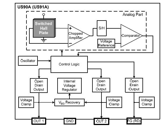 US90AEVK features: (1)Low cost; (2)High sensitivity Hall Sensor; (3)Locked rotor protection and auto-restart; (4)Power-efficient CMOS and power MOSFETs; (5)Built-in output protection clamping diode; (6)Integrated tachometer (US90A) or alarm (US91A) signal output; (7)2-coil fan driver with FG/RD output in 4-pin VK / VA and 8-pin narrow SOIC packages (all RoHS Compliant).