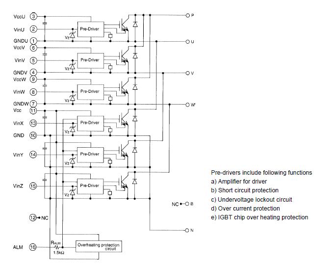 6MBP200RA060 absolute maximum ratings: (1)DC bus voltage: 450V; (2)DC bus voltage (surge): 500V; (3)DC bus voltage (short operating): 400V; (4)Collector-Emitter voltage: 600V; (5)Supply voltage of Pre-Driver: 0~20V; (6)Input signal voltage: 0~VzV; (7)Input signal current: 1mA; (8)Alarm signal voltage: VccV; (9)Alarm signal current: 15mA; (10)Junction temperature: 150℃; (11)Operating case temperature: -20~+100℃; (12)Storage temperature: -40~+125℃; (13)Isolating voltage: 2500V.