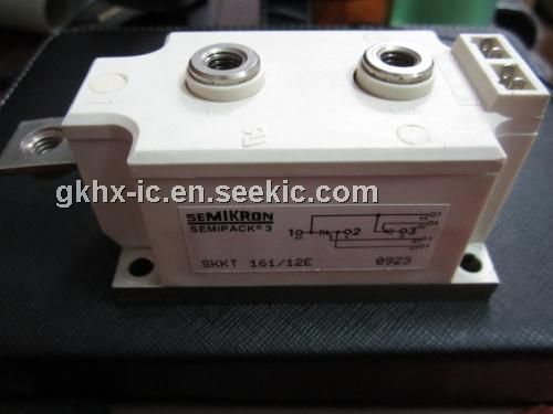 SKKT161 12E absolute maximum ratings: (1)ITAV sin. 180; Tc = 85 (100)℃: 156 (110)A; (2)IRMS P3/180F; T = 35 ℃; W1 / W3: 265/3 185A; (3)vT Tvj = 25 ℃; lT = 500 A: max. 1.6V; (4)VT(TO)Tvj = 125 ℃: max. 1V; (5)Idd;Ird Tvj = 125 VRD = VRRm, VDD = VDRM: max. 40mA; (6)tgd TVJ = 25 ℃; lG = 1 A: 1μS; (7)V VD = 0,67 VDRM: 2μS; (8)Il Tvj = 25 ℃; Rg = 33 O; typ. / max: 300/ 1000mA; (9)tq Tvj = 125 ℃: 150μS; (10)Ih Tvj = 25 CC; typ. / max: 150/400mA; (11)Il Tyj = 25 ℃; Rg = 33 Q; typ. / max: 300/ 1000mA; (12)Vqd Tvj = 125 ℃; d.c.: max. 0,25V; (13)IGD Tvj = 125 ℃; d.c.: max. 10mA; (14)Tvj: -40 to + 125℃; (15)Tstg: -40 to + 125℃.